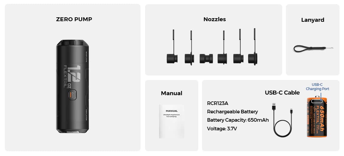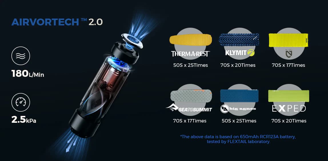 By integrating our patented AIRVORTECHâ„¢ Technology 2.0 with an exclusive micro-motor, ZERO PUMP reduces the unit's size and maintains superior performance. It can inflate your sleeping pad in just 50 seconds and can inflate up to 25 sleeping pads in a row. Compatible with leading brands such as THERM-A-REST, KLYMIT, NEMO, SEA TO SUMMIT, BIG AGNES, and EXPED, ZERO PUMP stands as the ultimate outdoor companion by your side.