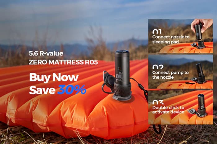 Simply attach the ZERO PUMP to your sleeping pad, double-click, and it does the work for you. No need to hold it in your hands—hands-free convenience! It only takes 60 seconds to inflate a FLEXTAIL 5.6 R-value ZERO MATTRESS R05.Add ZERO MATTRESS R05 now to save 30%.